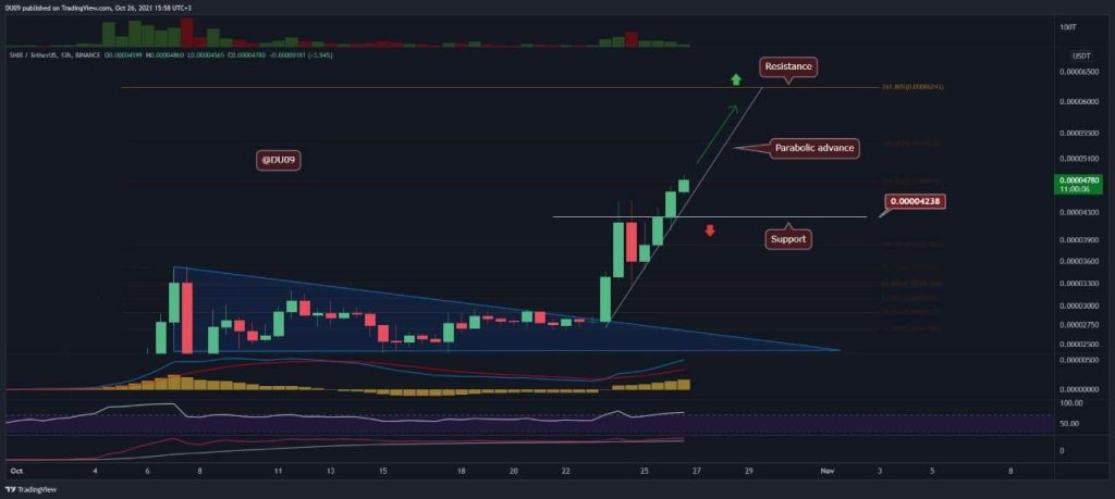 SHIB telah melampaui semua harapan dan telah berlipat ganda lagi dalam waktu sekitar satu minggu. Ini menunjukkan bahwa daya tarik koin meme melampaui banyak argumen mendasar di pasar altcoin. Grafik Shiba Inu jelas, harga naik secara parabola dengan kemungkinan resistensi di level Fibonacci berikutnya seperti yang ditunjukkan oleh grafik. Di sisi lain, area sekitar $0,000042 tampaknya menjadi kandidat yang baik untuk dukungan.