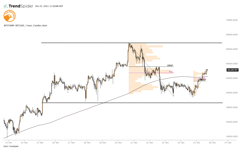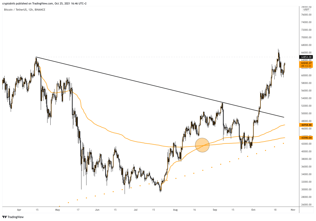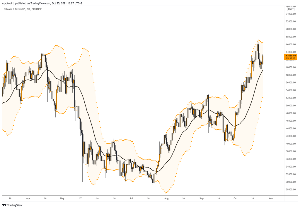 Kami telah melihat konfirmasi harian dari ATH baru pada 20 Oktober dengan penutupan harian lebih dari 65,9 ribu yang menunjukkan bahwa bulls merasa kuat di wilayah ini. Oleh karena itu, saya pribadi menganggap keseluruhan 67k->59,6k sebagai pola rentang konsolidasi – mis. panji atau segitiga kecil diikuti oleh penembusan yang layak melalui 70.000 USD sebagai target lokal berikutnya.