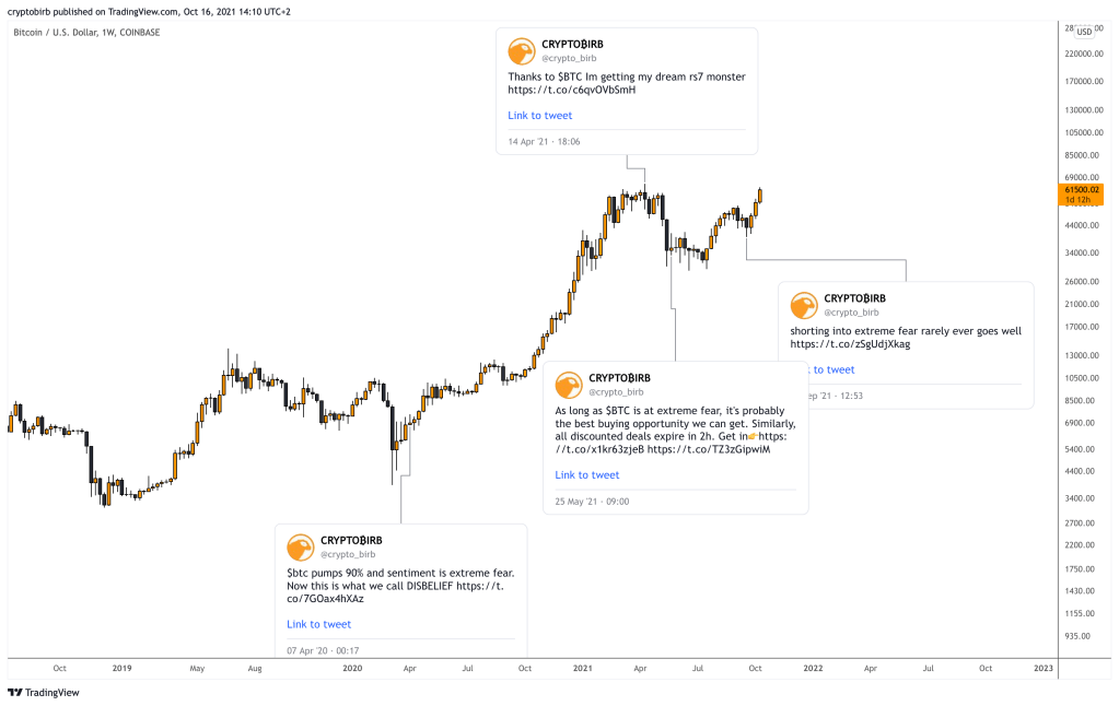 Ini mungkin titik di mana mayoritas akan salah dan mencoba memudarkan penembusan pada pembacaan pasar yang salah. Sentimen per indeks menunjukkan BTCUSD berada di 72 poin pada skala yang diklasifikasikan sebagai GREED. Tepat sebulan yang lalu ketika pasar menunjukkan ketakutan yang luar biasa, saya mengirimkan FINAL ULTIMATE BITCOIN BUY SIGNAL untuk pasar bull ini dengan harga 40000USD. Itu tidak terbukti apa-apa selain benar, nyata, nyata dan benar. Saya selalu menaruh uang di mana mulut saya berada dan sementara mayoritas meneriakkan target 5k, 15k, 20k, 30k, saya memuat sekitar 1M usd dalam btc, eth, ltc long termasuk posisi leverage kecil. Semua orang yang bergabung dengan saya dalam panggilan sudah merayakannya dengan baik Selain sukses besar, sekarang saatnya mayoritas akan mencoba mencari titik bearish tunggal untuk memvalidasi perasaan bearish mereka yang berasal dari garam yang tidak hanya mereka lewatkan pada kesempatan pembelian terakhir , tetapi juga kemungkinan mencoba untuk mempersingkat breakout lagi dan lagi dan lagi. Sekarang mereka lebih putus asa untuk menemukan APAPUN dan saya mengulangi tanda-tanda penurunan APAPUN untuk membenarkan celana pendek mereka. Anda akan melihat orang-orang dan guru palsu memberi tahu Anda bahwa pasar banteng telah mencapai puncaknya karena indeks ketakutan / keserakahan berada dalam keserakahan yang ekstrem.