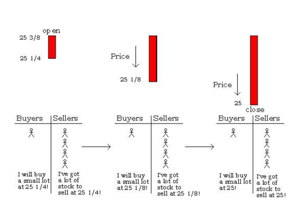 analisis kandil merah. Alasan harga pindah ke 25 1/4 karena banyak seller yang mau bongkar disana stok di 25 1/4, dan sedikit pembeli yang mau membeli di 25 1/4. Setelah semua pembeli membeli saham dengan harga 25 1/4, kelompok pembeli berikutnya naik untuk menawar untuk saham dengan harga lebih rendah dari 25 1/8.