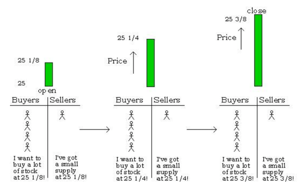 Hasil dari menggabungkan langkah-langkah ini adalah kandil hijau dengan harga pembukaan 25, reli dengan harga penutupan 25 3/8. Selama periode reli; namun, pembaca kandil yang cerdik akan dapat mengamati jangka panjang warna hijau kandil, dan simpulkan bahwa permintaan pembeli tinggi. Sekarang hanya ada satu alasan mengapa para pedagang meningkatkan permintaan dengan meningkatkan untuk membeli saham, dan itu karena mereka berpikir bahwa saham akan naik di waktu dekat. Jadi dengan mengamati warna dan ukuran kandil, pembaca kandil yang cerdik dapat