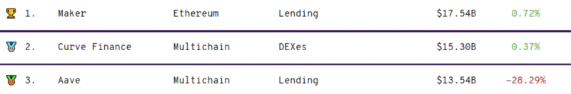 Aave tetap menjadi DeFi terbesar ketiga oleh TVL, hanya dilampaui oleh Maker dan Curve Finance.