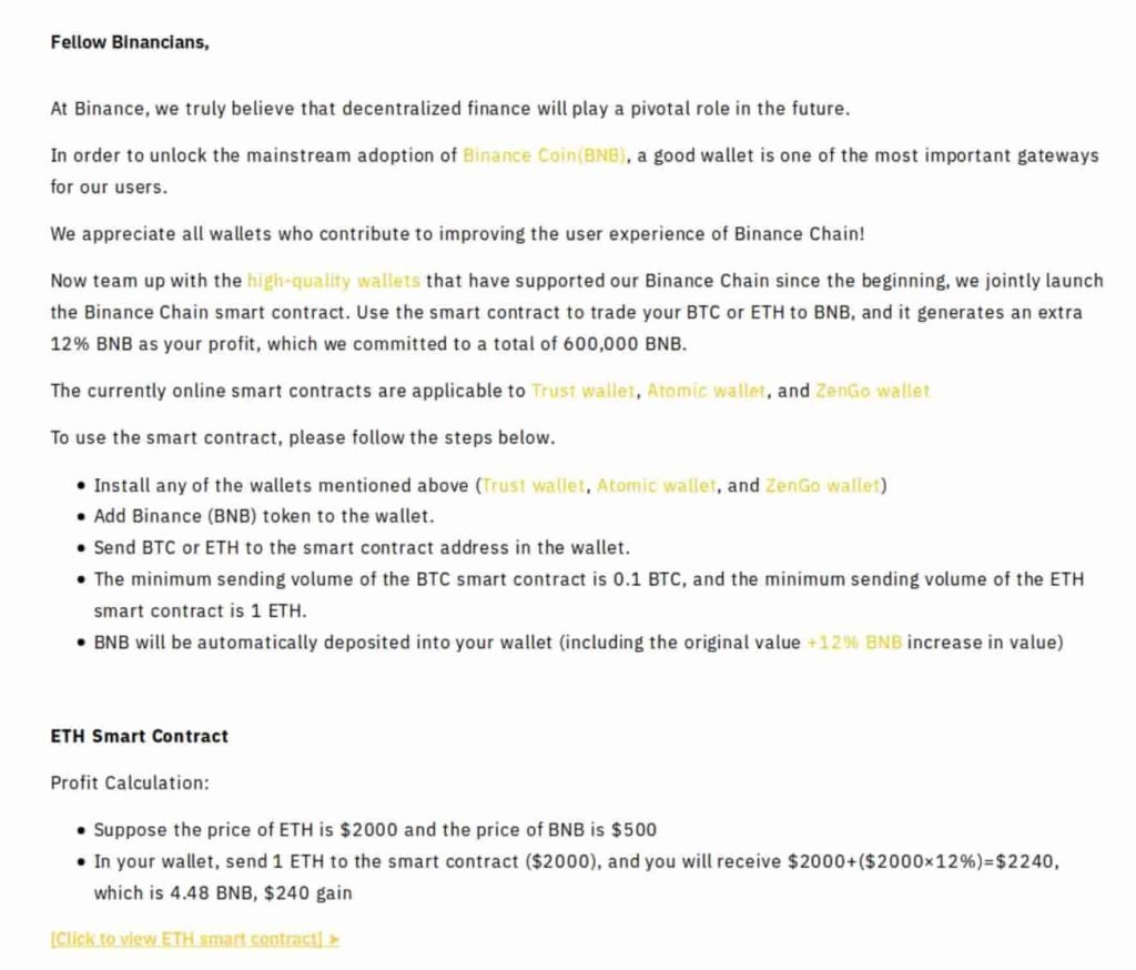 Selain itu, tautan tipuan menyertakan yang berikut ini dalam pengumuman palsunya:“Sekarang bekerja sama dengan dompet berkualitas tinggi yang telah mendukung Binance Chain kami sejak awal, kami bersama-sama meluncurkan kontrak pintar Binance Chain. Gunakan kontrak pintar untuk memperdagangkan BTC atau ETH Anda ke BNB, dan itu menghasilkan 12% tambahan sebagai keuntungan Anda, yang kami komitmenkan dengan total 600,00 BNB.”