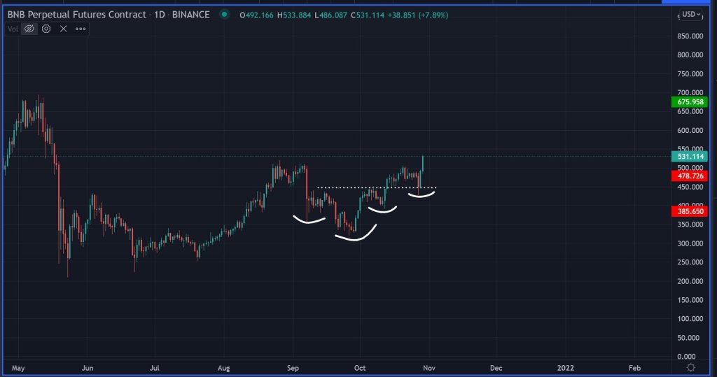 Menurut grafik pedagang, BNB telah keluar dari pola kepala dan bahu terbalik, formasi pembalikan yang menandakan dimulainya tren naik.Smart Contracter juga melihat Binance Coin terhadap Bitcoin (BNB/BTC), yang ia prediksi telah mengukir bagian bawah setelah mencetak pola kegagalan ayunan bullish (SFP).