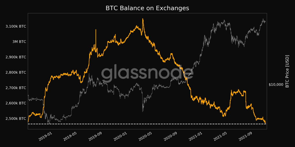 Menurut data baru dari perusahaan analitik on-chain Glassnode, cadangan pertukaran BTC sekarang berada pada level terendah dalam tiga tahun.