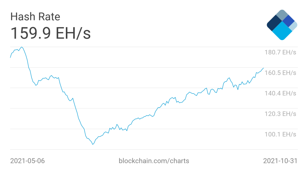 Tren data mentah naik dan turun, dan perkiraan yang berbeda sering berakhir dengan pembacaan yang sangat berbeda. Namun, tingkat hash rata-rata mingguan sekarang berada di sekitar 159 exahashes per second (EH/s) — lebih dekat dari sebelumnya ke rekor 180 EH/s dari April.