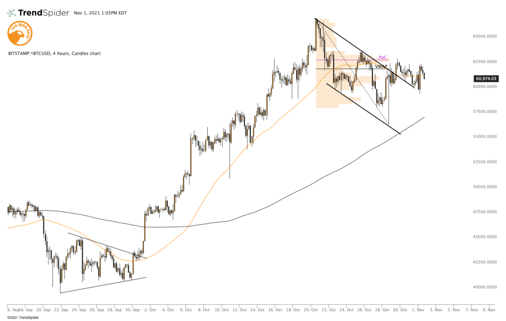 Gambar MTF menunjukkan gambaran zoom-in untuk koreksi bull flag dimana profil volume menunjukkan PoC (Point of Control) pada 62.8k.