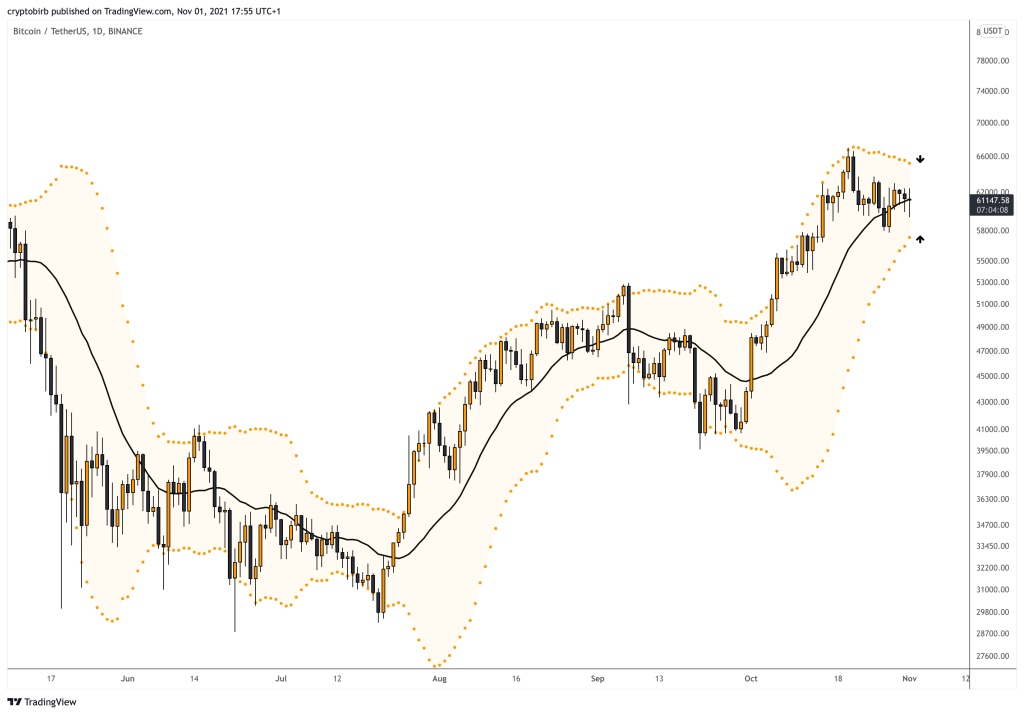 Support dan resistance berbasis volatilitas yang ditentukan oleh Bollinger Band bawah dan atas diberikan pada 58.7k dan 63.5k. Penembusan di kedua arah akan membawa volatilitas yang lebih tinggi dan lebih banyak risiko bagi pedagang jangka pendek.