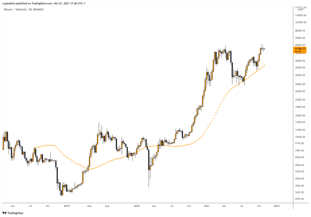 Rata-rata 50 – minggu terus naik mengkonfirmasikan pasar bull terus berlanjut dan tren menengah naik. Ini juga menegaskan bahwa penembusan ATH baru adalah konfirmasi arah dari candle bullish yang akan datang. Kemungkinan besar, volatilitas terbesar di minggu depan akan membawa 10-20k candle harian dan menetapkannya sebagai volatilitas default. Anda akan melihat bitcoin menarik unjuk rasa 60rb hingga 80rb jauh lebih cepat daripada yang dibutuhkan bitcoin untuk menembus dari 10rb menjadi 30rb. Kami akan segera mengalami pergerakan yang sangat eksplosif dengan banyak konfirmasi eksternal dari luar pasar – berita, TV, perusahaan raksasa yang menerima pembayaran kripto, dll.