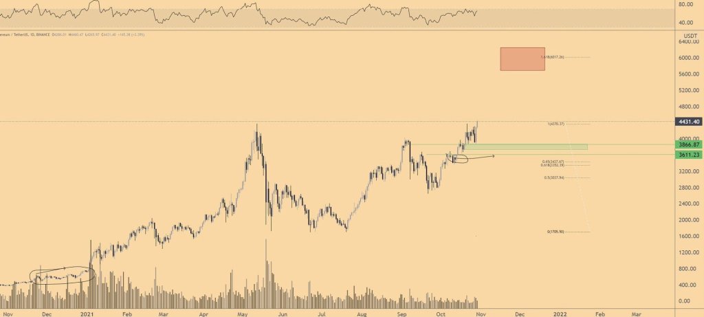 Proyeksi harga sederhana dan langsung untuk Ether ditawarkan oleh kontributor Cointelegraph Michaël van de Poppe, yang memposting grafik berikut yang memperkirakan “gerakan impulsif” dari $6.000 menjadi $6.400, yang dapat terjadi antara November 2021 dan Januari 2022.