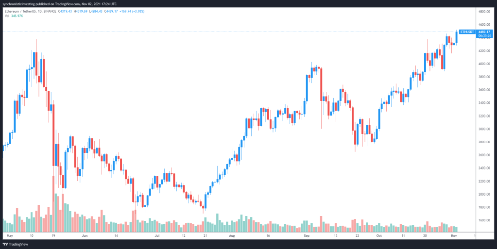 Data dari Cointelegraph Markets Pro dan TradingView menunjukkan bahwa sejak diperdagangkan pada level terendah $2.780 pada 29 September, harga Ether telah naik 62,54% lebih tinggi dalam waktu kurang dari sebulan untuk mencapai level tertinggi baru sepanjang masa di $4.523 pada 2 November.