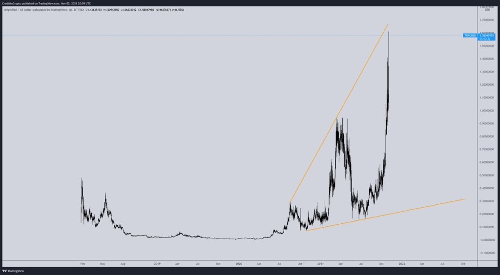 Analis pseudonim yang dikenal sebagai Credible Crypto memberi tahu 257.400 pengikut Twitter-nya bahwa struktur harga XRP terlihat sangat mirip dengan protokol berbagi data OriginTrail, yang token aslinya TRAC baru saja naik lebih dari 300% setelah listing baru-baru ini di Coinbase Pro.