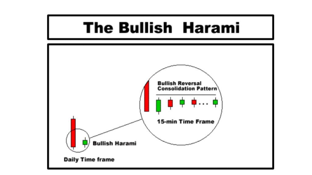 Mengubah kerangka waktu saat melihat pola kandil adalah alat yang berguna saat mencari pola mengarah ke peluang perdagangan yang baik. Misalnya, pertimbangkan Pola Bullish Harami yang dimanifestasikan pada kerangka waktu Harian grafik. Stok yang sama yang diplot pada grafik kerangka waktu 15 menit menunjukkan bahwa stok sebenarnya sedang disiapkan untuk pola Konsolidasi Pembalikan Bullish.