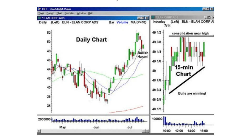 Menggunakan grafik Harian dan grafik 15 menit bersama-sama membuatnya lebih mudah untuk menemukan kemungkinan perdagangan peluang. Misalnya, pedagang dapat memindai pengaturan Harami pada grafik Harian, dan kemudian menarik 15 min chart untuk mengkonfirmasi saham sedang mengalami pola konsolidasi bersiap untuk break out.