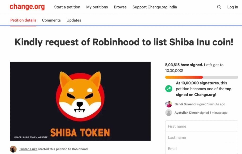 Khususnya, petisi untuk mencantumkan SHIB, dengan judul “Mohon permintaan Robinhood untuk mencantumkan koin Shiba Inu!” telah mengumpulkan 503.615 tanda tangan pada saat penulisan di situs web petisi Change.org, menjadikannya petisi peringkat nomor satu di platform.