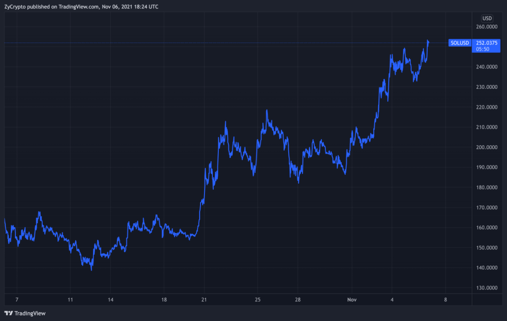 SOL merosot kembali ke $166 karena pembeli mengambil sebagian keuntungan dan sejak itu berusaha untuk menutup harga tertinggi sebelumnya. Pada hari Rabu, koin yang menempati peringkat keempat berdasarkan kapitalisasi pasar melonjak mencapai level tertinggi $248.