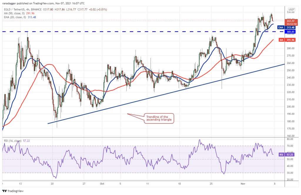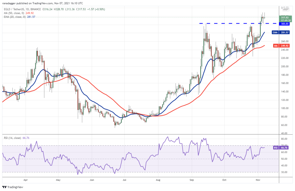 Elrond (EGLD) menembus di atas tertinggi sepanjang masa sebelumnya di $303,03 pada 3 November, yang merupakan tanda positif. Bear mencoba untuk menarik harga kembali ke bawah level breakout pada 5 dan 6 November tetapi gagal.