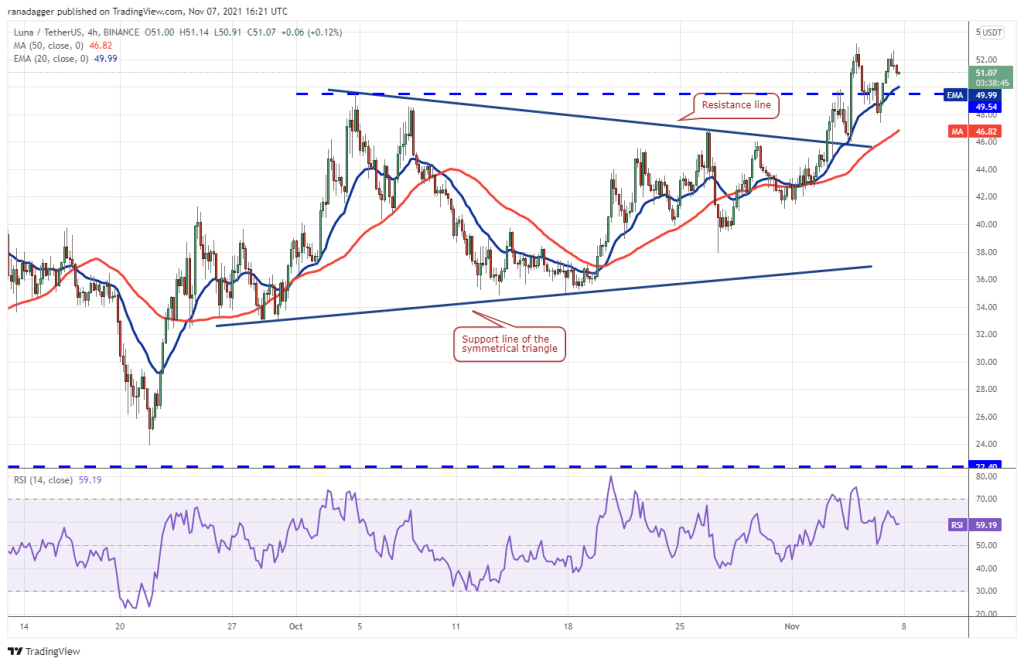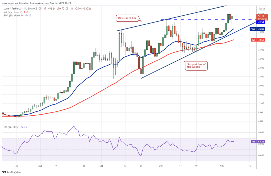 Token LUNA protokol Terra pecah dan ditutup di atas resistance overhead di $49,54 pada 4 November. Bear mencoba menarik harga kembali ke bawah level breakout pada 5 dan 6 November tetapi tidak dapat mempertahankan level yang lebih rendah. Ini menunjukkan bahwa sapi jantan membeli saat turun.