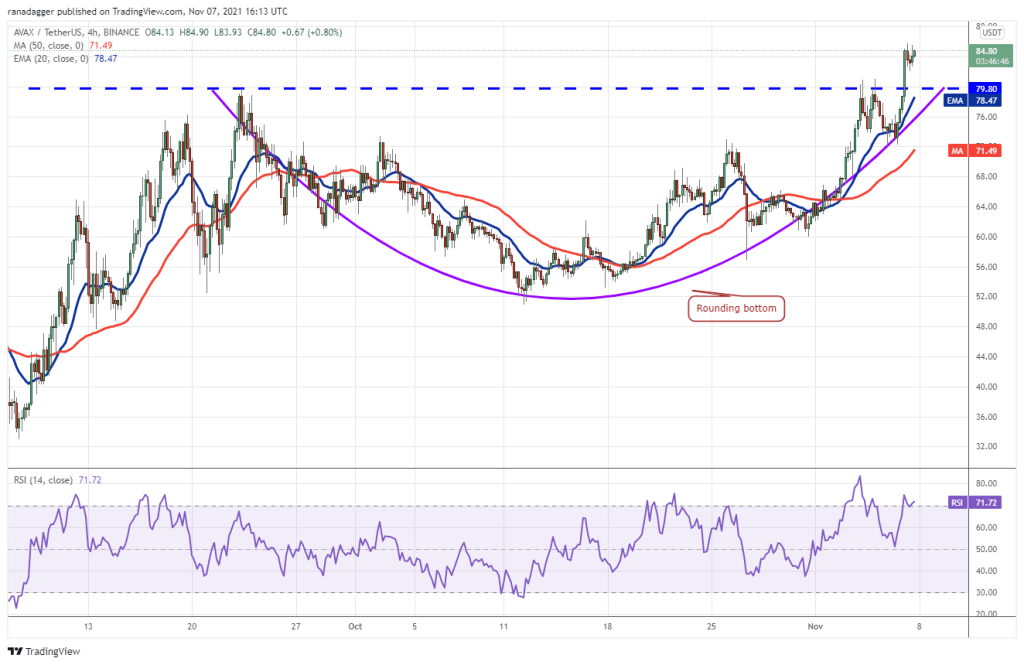 Rata-rata pergerakan yang meningkat dan RSI di wilayah overbought menunjukkan bahwa bull memegang kendali. Jika harga bertahan di atas $79,80, pasangan AVAX/USDT bisa reli ke $93,04 dan kemudian mencoba untuk menantang level psikologis di $100.