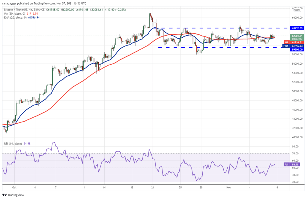 Grafik 4 jam menunjukkan pasangan terikat pada kisaran antara $63,732,39 dan $59,500. Rata-rata bergerak datar dan indeks kekuatan relatif (RSI) tepat di atas titik tengah menunjukkan keseimbangan antara penawaran dan permintaan.