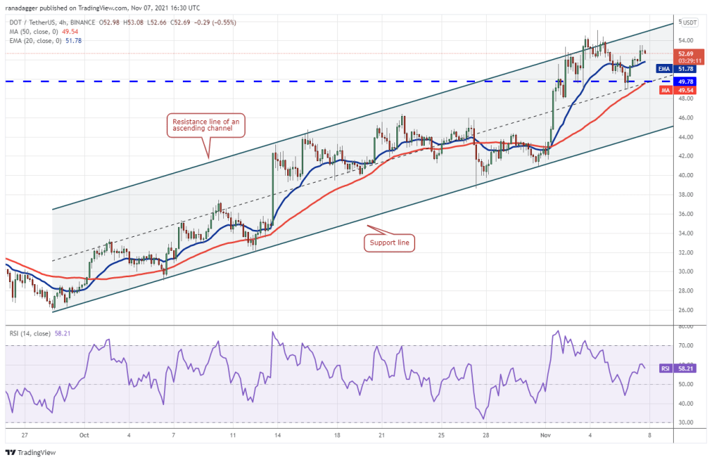 Jika bulls mendorong harga di atas $55,09, pasangan DOT/USDT bisa reli ke $63,08. Bear mungkin memiliki rencana lain karena mereka akan mencoba untuk menenggelamkan harga di bawah level breakout di $49,78. Langkah seperti itu akan menunjukkan kurangnya pembeli di tingkat yang lebih tinggi.