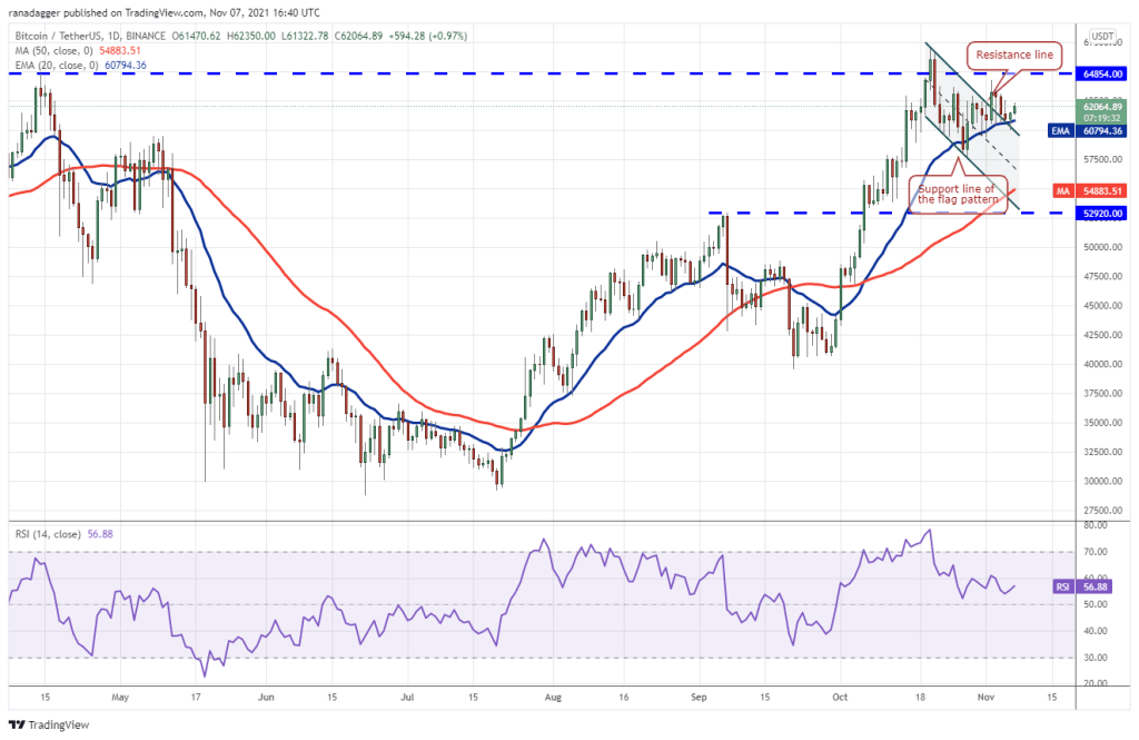 Bitcoin menembus di atas pola bullish flag pada 2 November tetapi pembeli tidak dapat memanfaatkan pergerakan ini dan mendorong harga di atas zona resistensi overhead pada $64.854 menjadi $67.000. Ini menunjukkan beruang belum menyerah dan mencoba untuk menghentikan pergerakan naik.