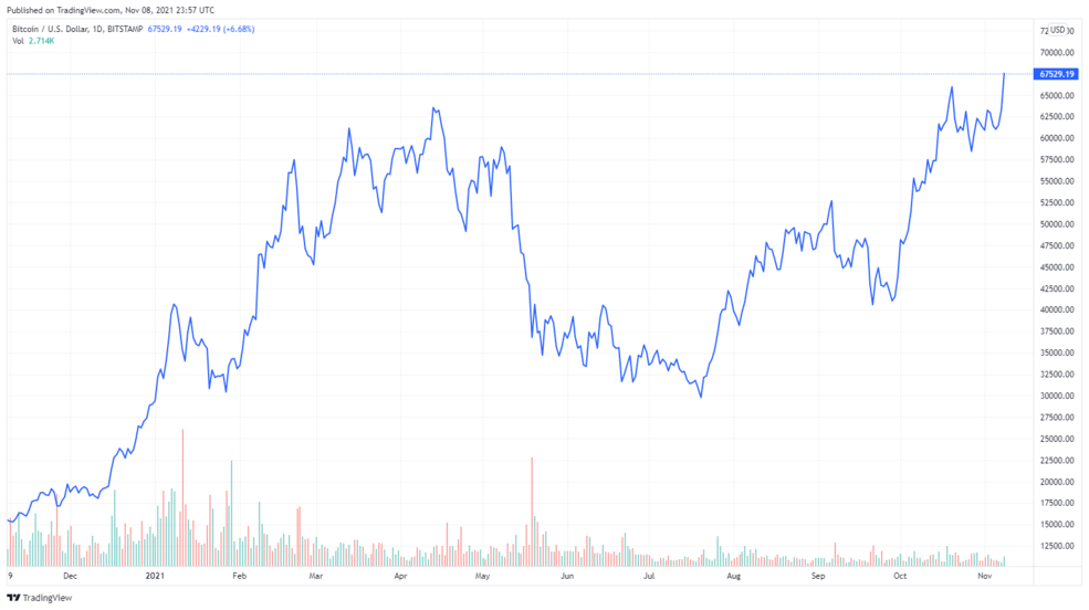 Kemarin, harga Bitcoin melonjak melewati $65k dan terkonsolidasi tepat di bawah rekor tertinggi sepanjang masa sebelumnya pada 20 Oktober 2021. Beberapa saat yang lalu, cryptocurrency utama lepas landas dan pada saat menulis baris ini, harga BTC mencatat rekor tertinggi baru sepanjang masa di atas $67.8K, menurut pertukaran Bitstamp.
