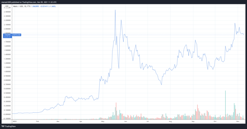 Menurut data oleh TradingView, saat ini (per 11:20 UTC pada 9 November), di bursa kripto FTX, $MATIC diperdagangkan sekitar $1,8664, yang kira-kira 23% di bawah harga tertinggi sepanjang masa $2.4450, yang dicapai pada 18 Mei.