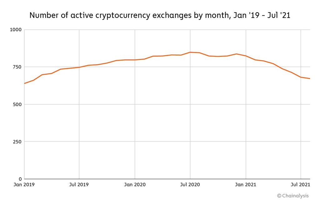 Jumlah bursa aktif mendatar sekitar Juli 2020 dan kemudian mulai turun. Itu duduk di 672 pada Agustus 2021, setelah memuncak pada 845 pada Agustus 2020. Mengapa jumlah pertukaran cryptocurrency aktif turun? Dan apa yang membedakan yang paling sukses dari mereka yang tersisa? Dalam laporan ini, kami mencoba menjawab pertanyaan tersebut dengan melihat perbedaan tren pertumbuhan bursa di sejumlah variabel.