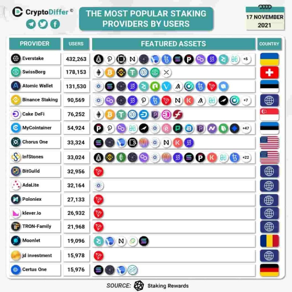 Pada 17 November 2021, Binance, yang sekarang menjadi pertukaran cryptocurrency paling populer dalam hal jumlah total pelanggan, adalah penyedia staking cryptocurrency terbesar keempat di dunia, menurut Crypto Differ; memang, Binance staking saat ini memiliki 90.569 pengguna yang mempertaruhkan cryptocurrency populer seperti Cardano, Polkadot, dan Algorand (ALGO).