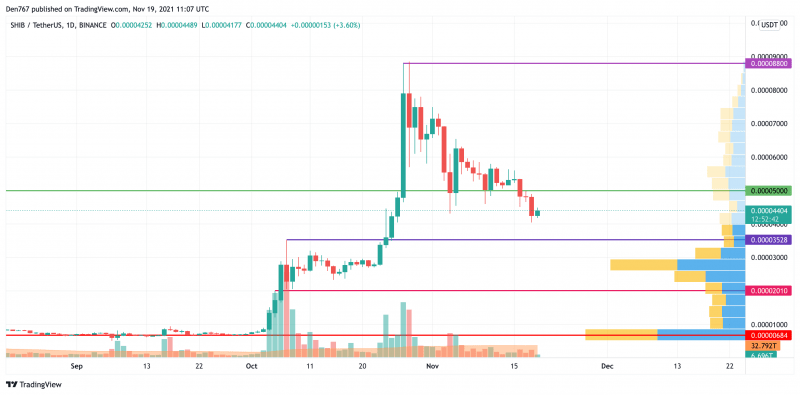 SHIB mematahkan dukungan di $0,000050 dan diperbaiki di bawahnya. Saat ini, beruang lebih kuat daripada sapi jantan, yang juga dikonfirmasi oleh volume perdagangan beli yang rendah. Pembeli harus kembali ke atas garis hijau untuk mengambil inisiatif, atau penurunan dapat berlanjut ke zona ungu di $0,00003528.