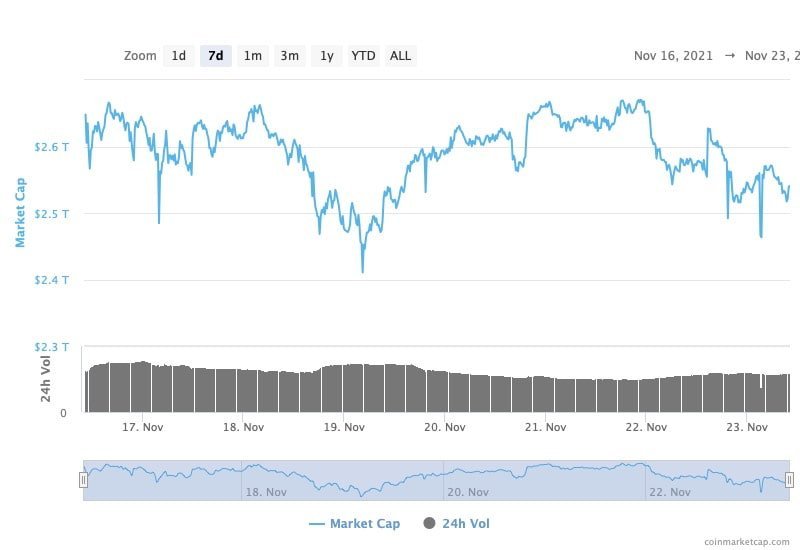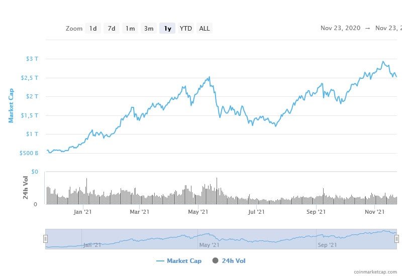 Namun demikian, terlepas dari koreksi jangka pendek, pasar telah melihat aliran masuk hampir $2 triliun selama 12 bulan terakhir mengambil kapitalisasi pasar $566,92 miliar pada 23 November 2020 dibandingkan dengan $2.521,45 miliar pada 23 November, menurut statistik CoinMarketCap.