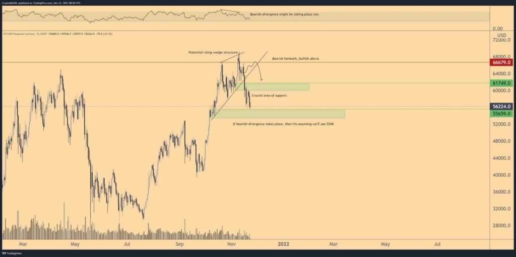 Sekarang Bitcoin telah jatuh di bawah area dukungan yang penting, dia menambahkan:"Jika divergensi bearish terjadi, maka saya berasumsi kita akan melihat $54k."