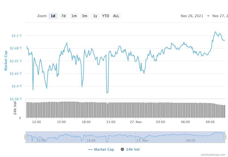 Namun demikian, selama 24 jam, pasar cryptocurrency global telah menunjukkan indikasi perkembangan, kembali ke hijau dan tumbuh nilainya hampir 1,5%, menempatkannya kembali di atas $2,5 triliun, sesuai statistik CoinMarketcap.