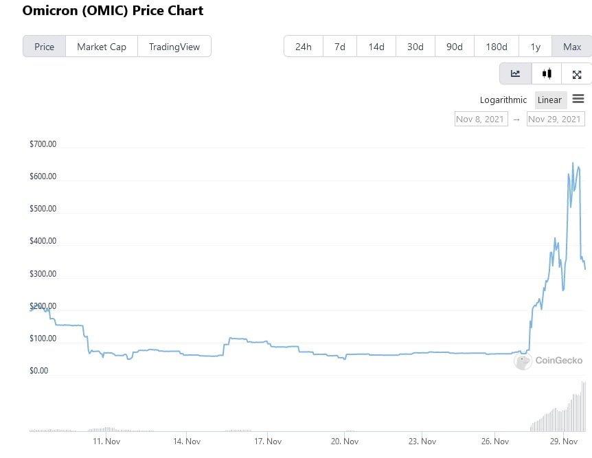 Cryptocurrency baru yang dijuluki Omicron (OMIC) melonjak nilainya antara 27 November dan 29 November, periode yang dikoreksi pasar atas kekhawatiran mengenai varian Covid-19 baru, yang juga diidentifikasi sebagai Omicron.