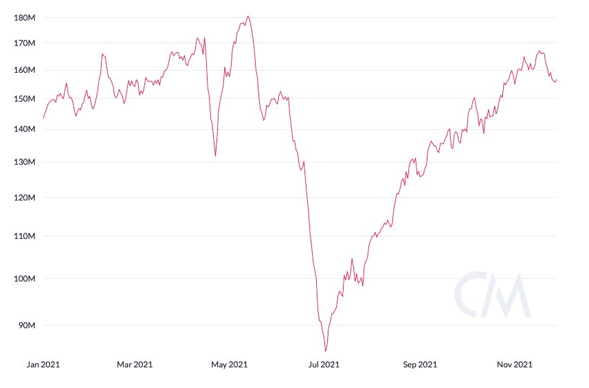 Ketika negara dengan bagian terbesar dari tingkat hash Bitcoin pada saat itu mulai memberlakukan upaya nasional untuk menindak industri, sejumlah besar penambang terpaksa offline. Akibatnya, tingkat hash total jaringan Bitcoin anjlok menjadi 84,79 exahash per detik (EH/s) pada awal Juli, per data Metrik Koin. Metrik telah pulih hampir sepenuhnya, dan pada saat penulisan, berada di 156,6 EH/s — kurang dari 16% dari tertinggi baru sepanjang masa. Itu telah ditarik dari puncak lokal yang dibuat pada 167,18 EH/s pada 17 November.