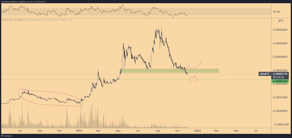 Van de Poppe menyimpulkan analisisnya dengan melihat Cardano pada grafik Bitcoin. Menurutnya, 2350 satoshi adalah dasar penting pada pasangan perdagangan ADA/BTC, dengan potensi penembusan di atas 3000 sat beberapa bulan ke depan.