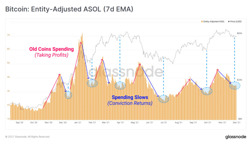 Tetapi penjualan LTH hanyalah lonjakan yang disebabkan oleh FUD karena merupakan lonjakan pertama sejak Oktober. Selain dalam skala makro, kepercayaan investor sebenarnya meningkat karena lebih sedikit koin yang dibelanjakan saat ini.