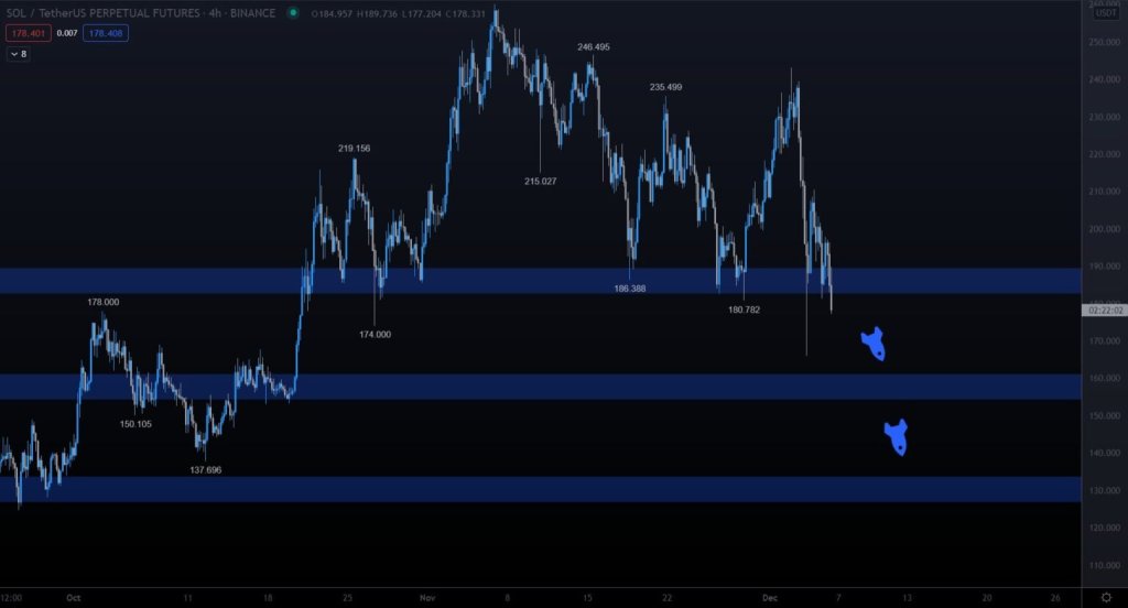 SOL telah jatuh sejak mencapai harga tertinggi sepanjang masa $259,9 pada 6 November. Penurunan berlanjut hingga harga terendah $169 tercapai pada 4 Desember.