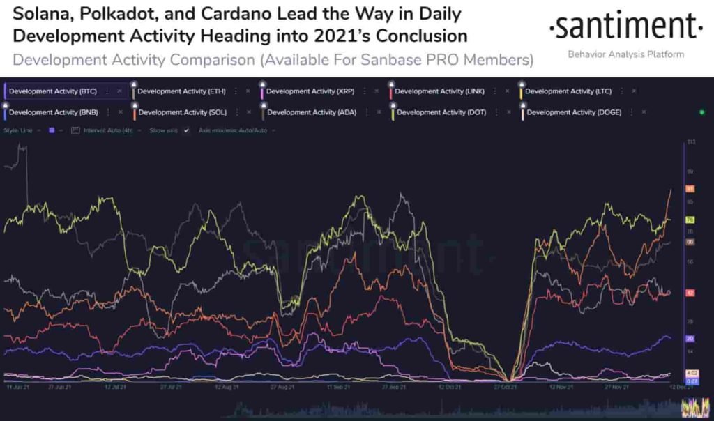 Menariknya, data dari Coin Metrics menunjukkan bahwa alamat teratas ini mengumpulkan lebih banyak ADA, yang berkorelasi dengan meningkatnya aktivitas pengembangan di jaringan. Selanjutnya, Cardano, Polkadot, dan Solana semuanya menduduki peringkat 3 jaringan teratas dengan aktivitas pengembangan harian tertinggi hingga akhir tahun 2021, menurut data dari Santiment.