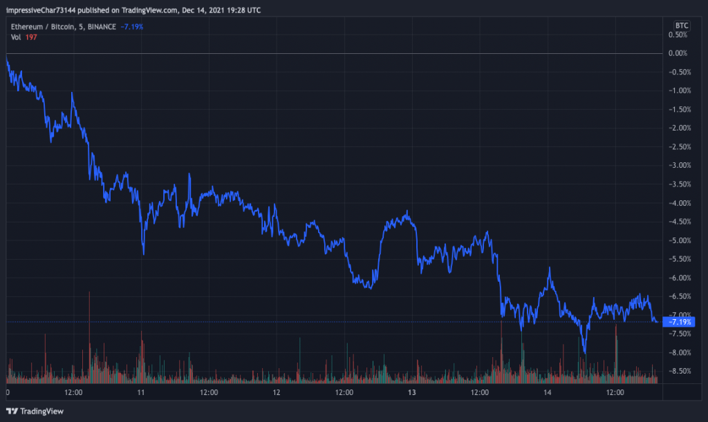 Setelah reli 24% hingga tertinggi lokal 0,0880, rasio ETH/BTC telah menurun 7,19% selama lima hari terakhir menjadi 0,0802, menurut data dari TradingView.