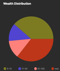 Data dari Pantai Solana mengkonfirmasi pernyataan terakhir, yang menyatakan bahwa 80,78% dari persediaan disimpan hanya di 173 dompet. Distribusi dapat dilihat pada diagram lingkaran berikut yang menguraikan persentase pasokan yang dipegang oleh dompet 10 teratas, 50 teratas, 100 teratas, dan yang tersisa: