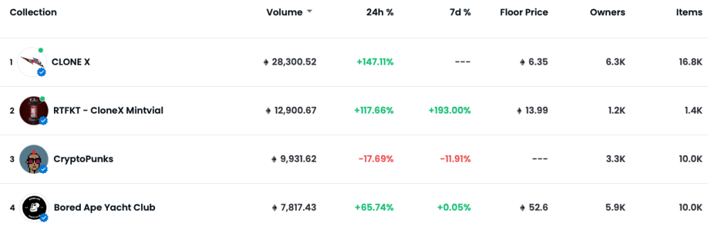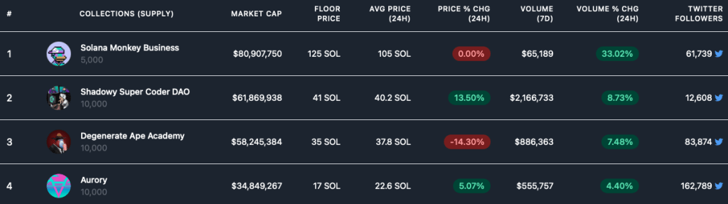 Data perdagangan dari OpenSea dan Solanalysis dari beberapa proyek Solana dan Ethereum teratas dapat ditemukan di bawah ini: