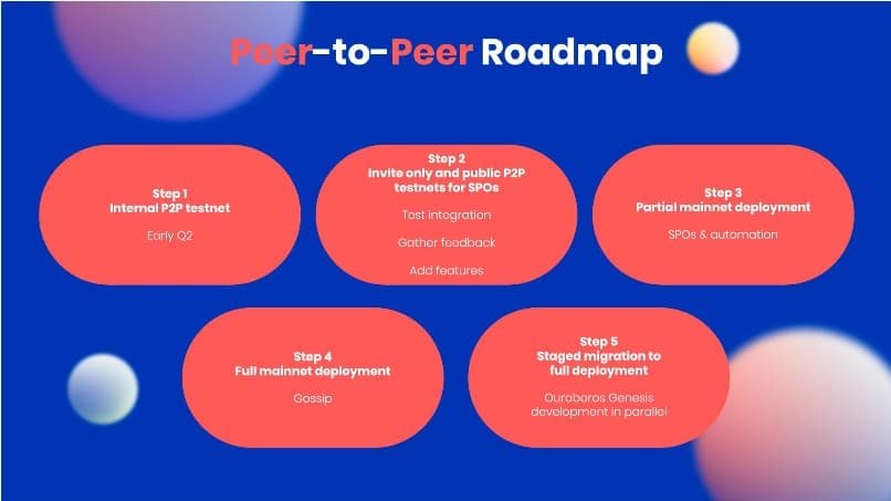 Cardano menyatakan bahwa fungsionalitas P2P masih menjalani tes dan tidak akan diintegrasikan ke dalam jaringan sepenuhnya meskipun diluncurkan. Akibatnya, kemampuan P2P diatur untuk disertakan dalam cabang master Cardano-node.