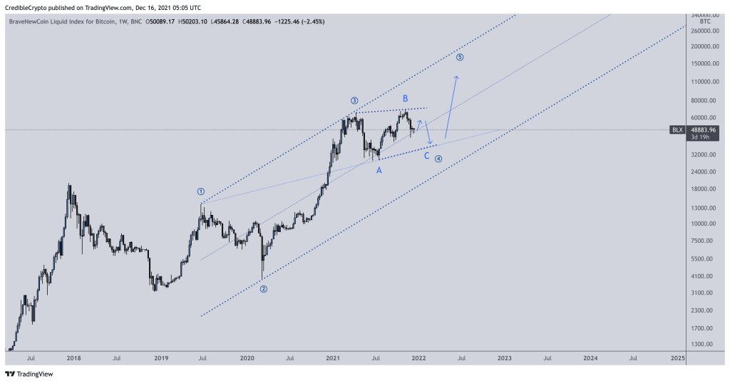 Analis kripto menggunakan teori Elliott Wave, pendekatan analisis teknis yang memprediksi aksi harga di masa depan dengan mengikuti psikologi kerumunan yang cenderung bermanifestasi dalam gelombang. Menurut Credible, Bitcoin masih berada di tengah gelombang empat, fase korektif dari tren naik lima gelombang. Pedagang crypto mengatakan bahwa pergerakan di bawah $40.000 akan menyelesaikan gelombang keempat dan menempatkan BTC dalam posisi untuk menyalakan gelombang kelima dan terakhir dalam perjalanan ke atas $100.000 pada Juli 2022.