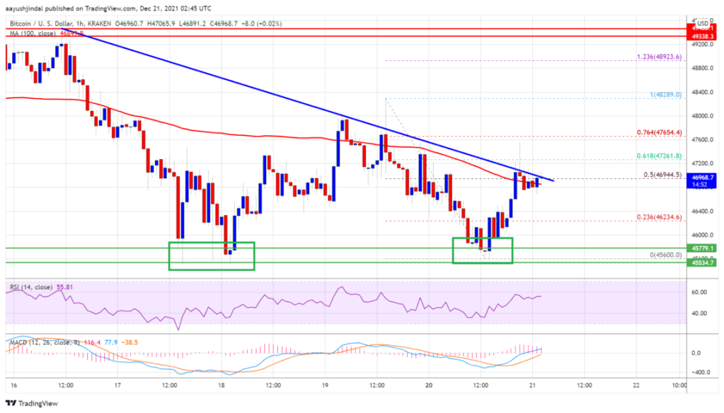 Bitcoin memulai koreksi terbalik dari zona dukungan $45.500. Harga sekarang diperdagangkan mendekati $47.000 dan rata-rata pergerakan sederhana 100 jam. Ada garis tren bearish utama yang terbentuk dengan resistensi di dekat $47.000 pada grafik per jam dari pasangan BTC/USD (umpan data dari Kraken). Pasangan ini bisa memulai kenaikan besar jika ada pergerakan yang jelas di atas resistensi $47.000.