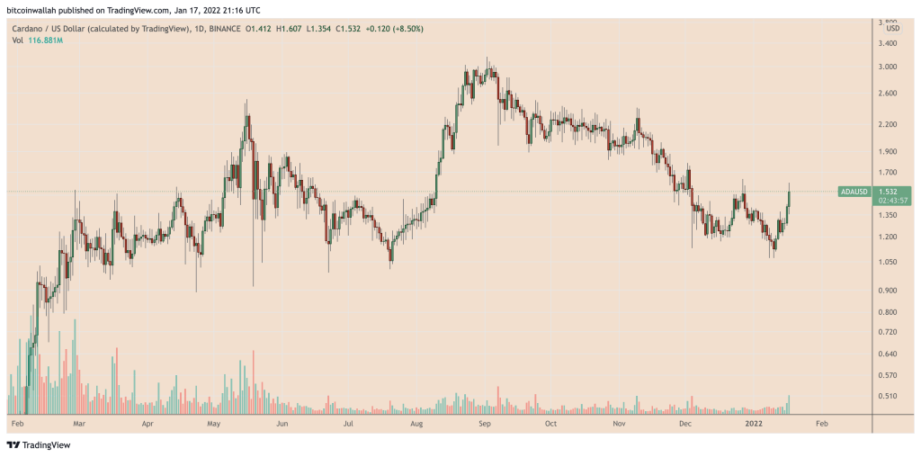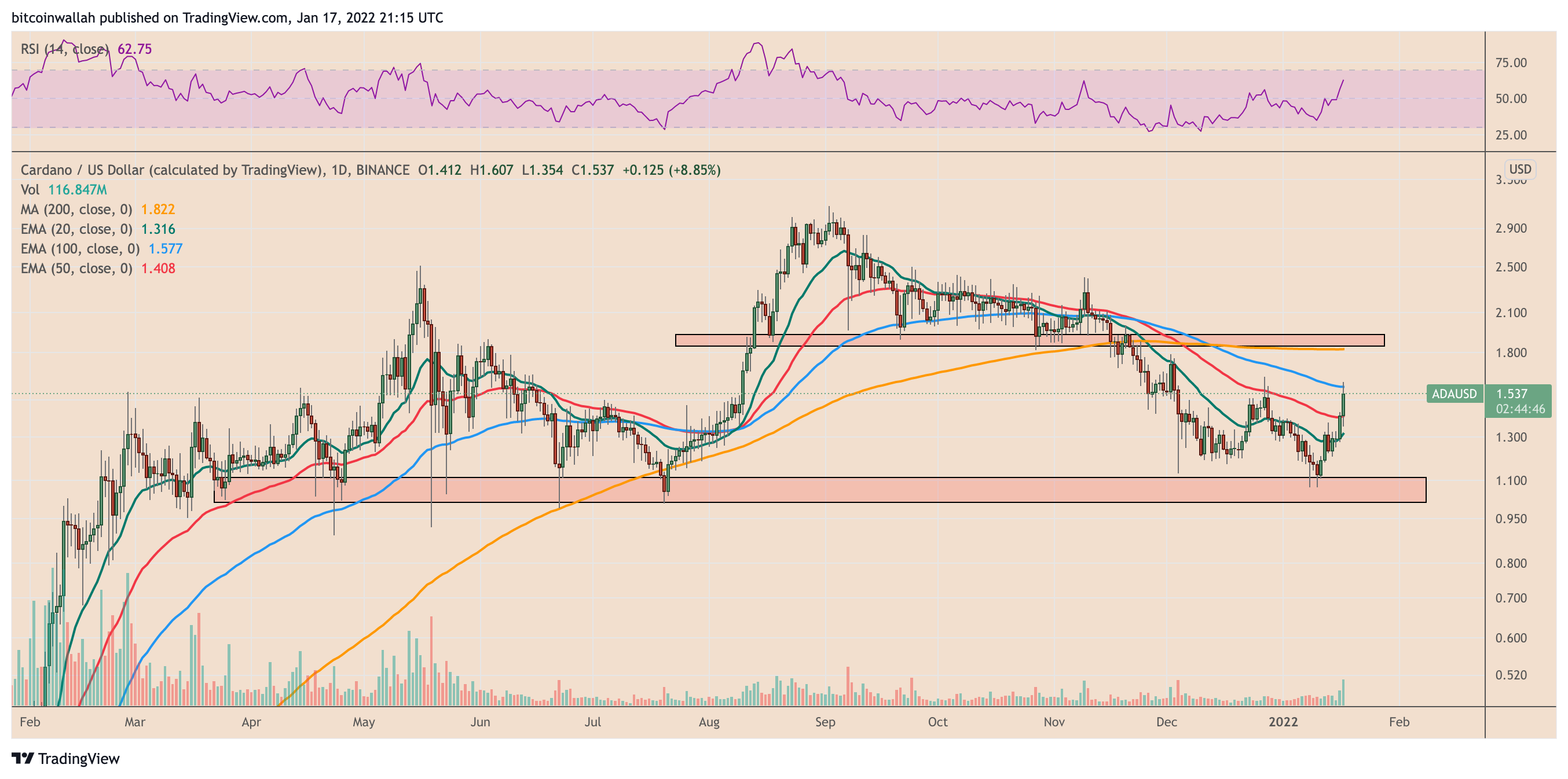 Harga ADA naik hampir 12% pada 17 Januari untuk mencapai tertinggi intraday $1,60, sehari setelah SundaeSwap mengumumkan peluncuran “pertukaran terdesentralisasi beta (DEX) yang berfungsi penuh.” Meskipun demikian, ayunan naik juga datang sebagai bagian dari tren rebound yang lebih luas di mana ADA melonjak hampir 50% hanya dalam tujuh hari.