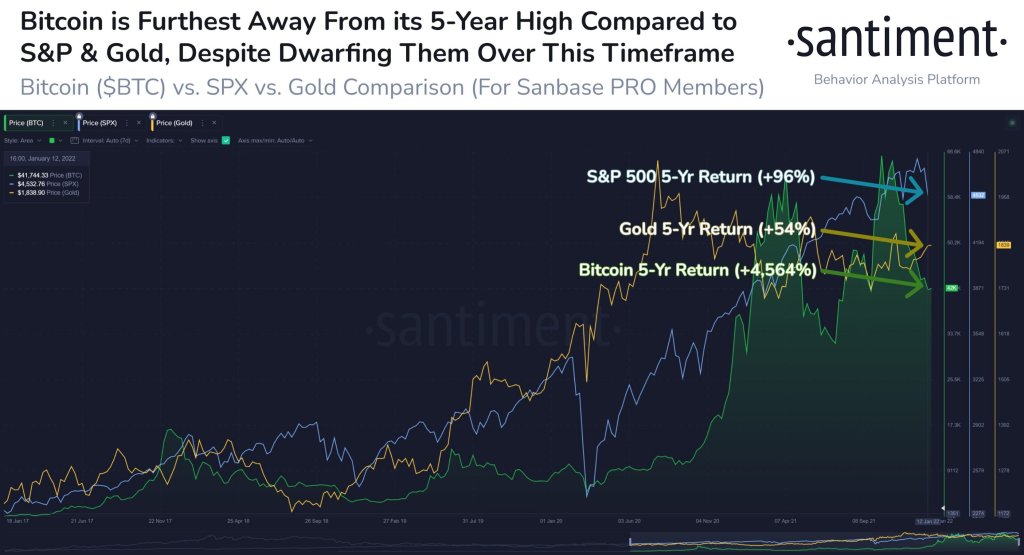 Sementara king crypto turun hampir 43% dari level tertinggi sepanjang masa di $68.700 yang ditetapkan pada awal November, perusahaan analitik pasar mencatat bahwa pengembalian BTC selama lima tahun terakhir masih 47,5 kali lebih tinggi daripada S&P 500 dan 84,5 kali lebih tinggi. dibanding emas.