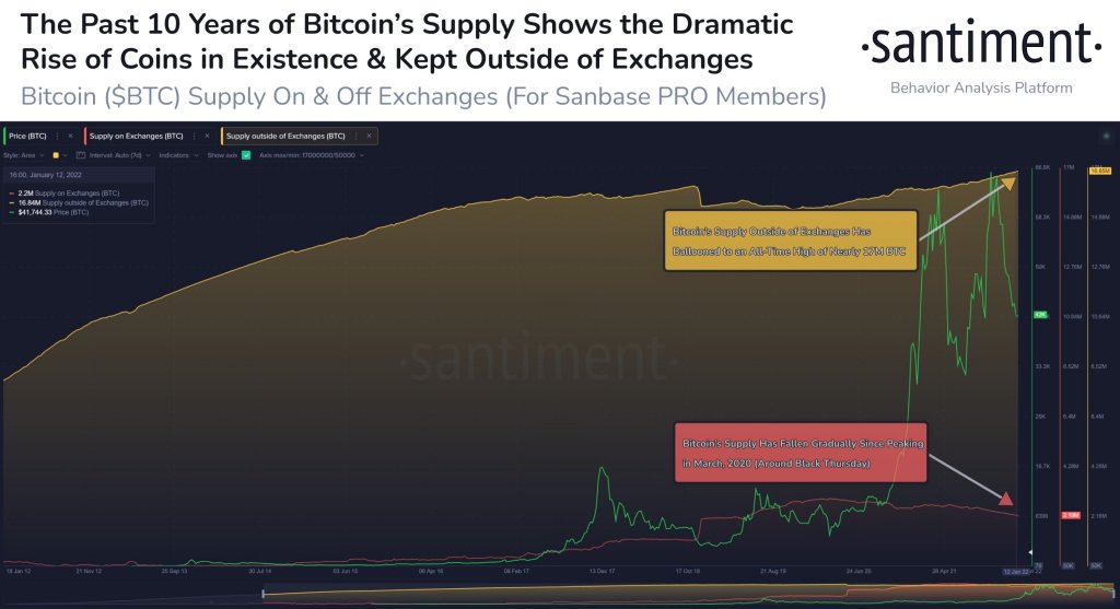 Santiment mengatakan bahwa 8,91 juta lebih banyak BTC disimpan di dompet non-pertukaran dibandingkan dengan satu dekade lalu. Jumlah total off-exchange Bitcoin sekarang berada pada titik tertinggi sepanjang masa hampir 17 juta token, menurut perusahaan analitik.