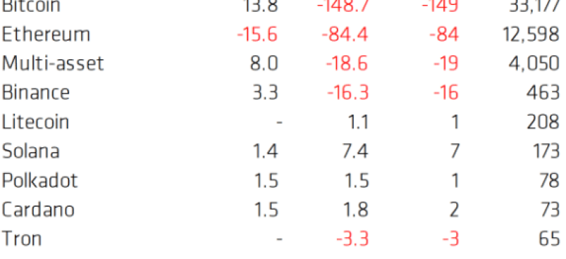 Sementara Ethereum kehilangan arus keluar $16 juta minggu lalu, pesaing Ethereum Solana, Cardano, dan Polkadot semuanya menikmati arus masuk kecil pada minggu ini masing-masing sebesar $1,5 juta, $1,5 juta, dan $1,4 juta.
